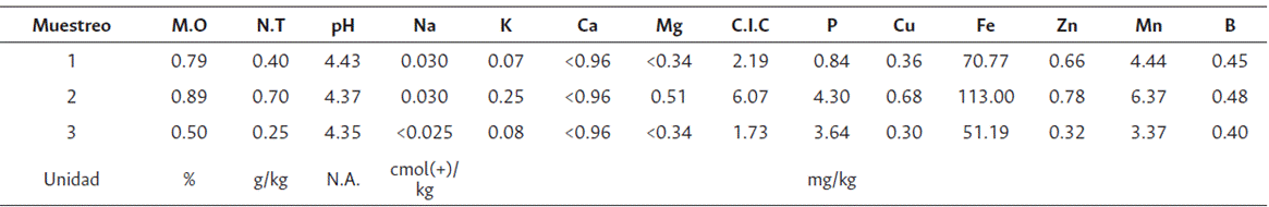 El análisis de suelo previo a la aplicación del compost orgánico mostró un suelo con características ácidas (pH entre 3.5 y 4.5), lo que implicaría toxicidad y deficiencias de algunos elementos como P, Ca, Mg y Mo, para las plantas cultivadas (Soil Science Division Staff, USDA, 2017). Además, se encontró un bajo contenido de materia orgánica (<2 %), aún para clima cálido. P y K mostraron una baja concentración (Tabla 1).