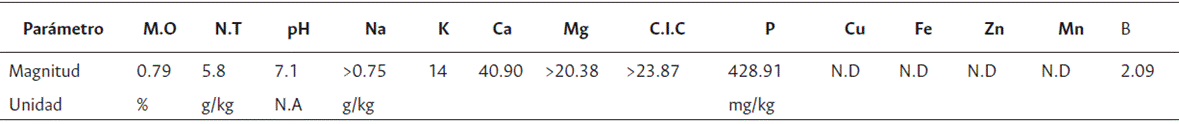 N.A: no aplica; N.D: no determinado; M.O: materia orgánica; N.T.: nitrógeno total; C.I.C.: capacidad de intercambio catiónico.