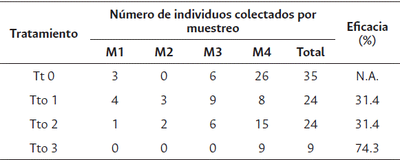 El muestreo fue realizado excluyendo los bordes de cada parcela para disminuir las variables de error por posible contaminación con el tratamiento aplicado en parcelas vecinas. Una vez capturados, los insectos fueron dispuestos en viales de vidrio de 10 ml, con alcohol al 70 %, para su posterior identificación y conteo. Los monitoreos fueron realizados semanalmente, el día después de cada aplicación del tratamiento, con el fin de verificar su eficacia, siguiendo las normas del manual de protocolos de ensayos de eficacia (Agrocalidad, 2016).