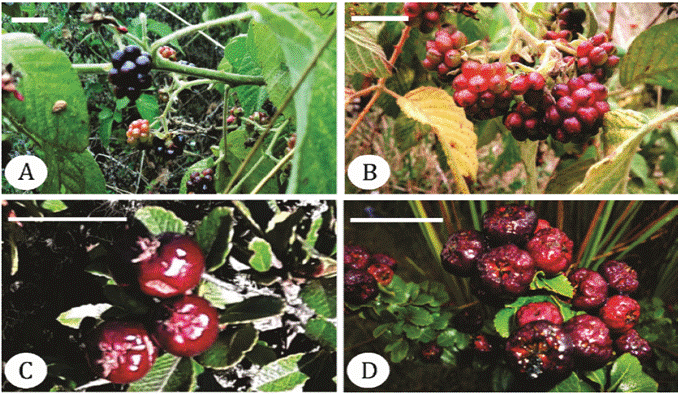 Figure 1: High Andean wild fruits of the genus Rubus and Hesperomeles. A: black siraca, B: red siraca, C: pacra, and D: capachu. The white bar indicates 1 cm.