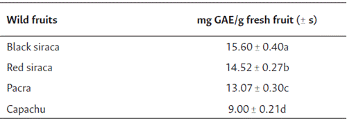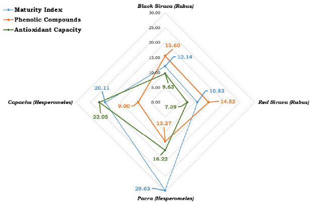 The maturity index was related to the higher content of phenolic compounds and antioxidant capacity in the wild fruits pacra and capachu; on the contrary, a lower maturity index affected the values of black siraca and red siraca.