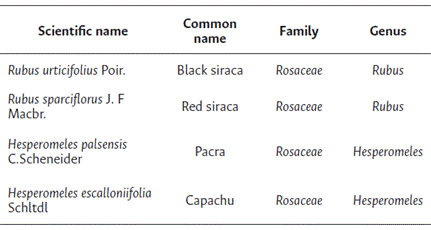 The taxonomic identification of the wild fruits showed that the black siraca and red siraca belong to the genus Rubus, species Rubus urticifolius Poir and Rubus sparciflorus J. F Macbr., respectively; on the other hand, the fruits pacra and capachu correspond to the genus Hesperomeles, species Hesperomeles palsensis C. Scheneider and Hesperomeles escalloniifolia Schltdl, respectively.