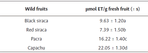 Capachu was the wild fruit with the highest antioxidant capacity (22.05 µmol Eq*Trolox (ET)/g), followed by pacra, black siraca, and red siraca (Table 4).