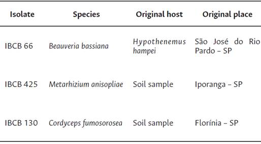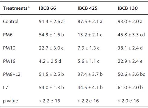 Table 3: Germination percentage (mean ± SE) of B. bassiana (IBCB 66), M. anisopliae (IBCB 425), and C. fumosorosea (IBCB 130) with different PP treatments
