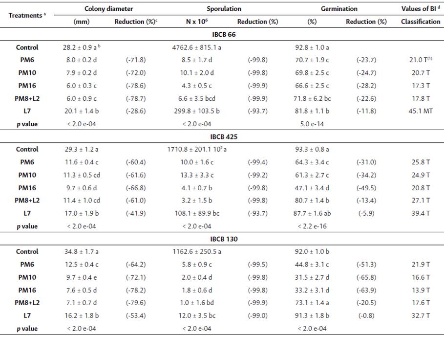 The compatibility between the evaluated PPs and EF was calculated based on the BI, according to Rossi-Zalaf et al. (2008), as follows: BI = [47(VG) + 43(ESP) + 10(GER)]/100, where BI = biological index, based on the percentage of vegetative growth (colony diameter) (VG), the percentage of sporulation (ESP), and the germination percentage (GER) of fungal colonies in relation to the respective control. The limits established were: Toxic: 0 - 41; moderately toxic: 42 - 66; and compatible: > 66.