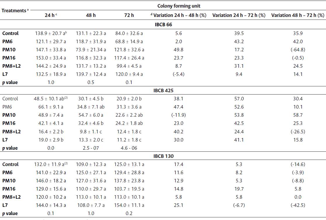 The PPs evaluated did not affect the number of CFUs of B. bassiana or C. fumosorosea with respect to the control, independently of the persistence time of EF on the grains. In B. bassiana, the variation percentage ranged from 2 to 50 % between the different times evaluated, whereas in C. fumosorosea, it ranged from 0 to 25 %. In M. anisopliae, the number of CFUs varied, independently of the persistence time of EF on the grains. The greatest decrease in the number of CFUs was observed with the application of L7, followed by PM16, PM10, PM6 and PM8+L2. The control showed a mean compatible with all PPs (Table 5).