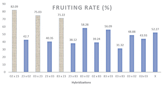 The joint data of fruit set showed an average of 52,27 % with an amplitude from 31,32 % to 82,09 %, and significant differences between some reciprocal crosses (Figure 1). The fruiting rate of male parents was 54,09 % and that of females was 52,57 %, showing the average non-superiority of genotypes when used as parents (Table 2).