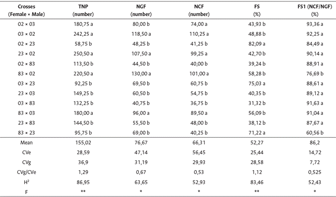 In the analysis of variance, there was a significant effect of the source of variation of treatments on all characteristics, according to the F test at the 1 % or 5 % probability level (Table 1). The estimates of the environmental coefficient of variation (CVe) were high for the number of green and cherry fruits per branch, and the ratio between the genetic and environmental coefficients of variation (CVg/CVe) was greater than 1.0 for the total number of pinheads per branch and the percentage of fruit set (fruiting) only. These characteristics had estimates of genotypic coefficient of determination (H) higher than 80 %, characterizing good experimental precision and favorable conditions to obtain gains with selection.