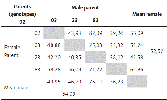 In this study, differences were observed between reciprocal crosses involving genotypes 83 and 23, highlighting the maternal effect for the combinations in which these parents are used as pollen-receiving plants.
