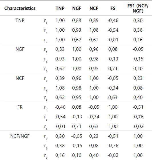 The estimates of genotypic correlations were negative for all associations involving the FS characteristic, being of greater magnitude with TNP (-0.54).