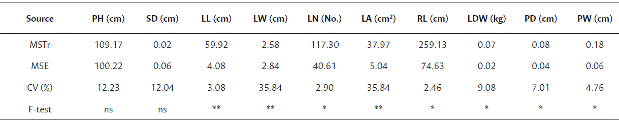 Note: ns: non-significant difference, *, **: significant difference at p < 0.05 and 0.01, respectively. MSTr: mean square treatment, MSE: mean square error, CV: coefficient of variation, PH: plant height, SD: stem diameter, LL: leaf length, LW: leaf width, LN: leaf number, LA: leaf area, RL: rachis length, LDW: leaf dry weight, PD: petiole diameter, PW: petiole width.