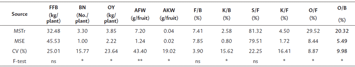 Note: ns: non-significant difference, *, **: significant difference at p < 0.05 and 0.01, respectively. MSTr: mean square treatment, MSE: mean square error, CV: coefficient of variation, FFB: fresh fruit bunch, BN: bunch number, OY: oil yield, AFW: average fruit weight, AKW: average kernel weight, F/B: fruits per bunch, K/B: kernels per bunch, S/F: shell per fruit, K/F: kernels per fruit, O/F: oil per fruit, and O/B: oil per bunch.