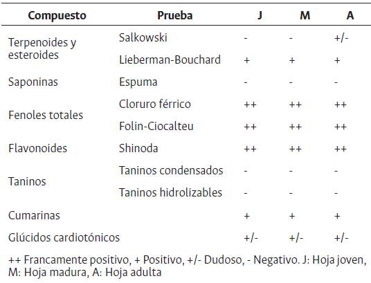 En el estudio preliminar de compuestos fitoquímicos se encontró que las hojas de M. oleífera, en los tres estados fenológicos, contenían terpenoides, esteroles, fenoles, flavonoides, cumarinas y glúcidos cardiotónicos (Tabla 1).