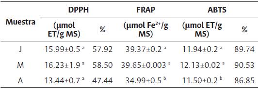 J: Hoja joven, M: Hoja madura, A: Hoja adulta, %: porcentaje de eliminación de radicales. Los resultados están expresados como media ± DE. Diferente letra indica diferencia significativa entre las muestras.