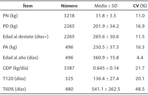 La Tabla 1 presenta medias, desviaciones estándar y coeficientes de variación (CV) de las características evaluadas. Las medias fueron: 31.8 ± 3.5 kg (PN), 201.9 ± 34.2 kg a una edad promedio de 265.6±30.6 días (PD), 230.5±37.3 kg a una edad media (edad del pesaje más próximo al año) de 360.9±15.7 días (PA) 0.645±0.14 kg/día (GDP), 136.4±27.4 (T120) y 541.1±262.5 días o 18±8. 7 meses (T60 %). Esto mostró un potencial productivo y una variabilidad fenotípica en la raza BON.