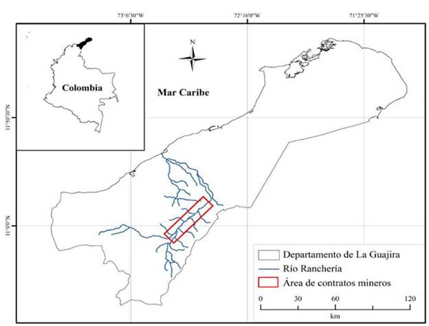 Los cuerpos de agua que serían modificados se localizan en la cuenca hidrográfica del rio Ranchería, extremo norte de Colombia (Fig. 1). El río Ranchería nace en el páramo de Chirigua, flanco oriental de la Sierra Nevada de Santa Marta, a 3875 m s.n.m. (Corpoguajira, 2011). Luego de un recorrido aproximado de 248 km desemboca en el mar Caribe, en el norte de Riohacha, capital del departamento de La Guajira, Colombia (Corpoguajira, 2011). El aporte de aguas proviene casi exclusivamente de las escorrentías de la Sierra Nevada de Santa Marta, sin embargo, en la porción central y baja de la cuenca recibe el aporte de tributarios menores provenientes de la Serranía de Perijá (Corpoguajira, 2011).
