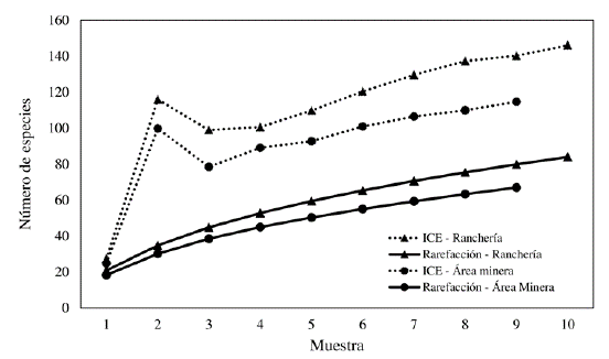 Figura 2: Curvas de rarefacción de Coleman, mostrando la riqueza de especies observada, y curvas del número estimado de especies según el ICE con 50 aleatorizaciones. Las curvas para la cuenca del río Ranchería simbolizadas por triángulo (); las curvas para el área de concesión minera simbolizadas por círculo (•). Para estimar el número de especies en la cuenca del río Ranchería consideramos todos los estudios contratados por la empresa operadora (n = 10); para estimar el número de especies en el área de concesión minera retiramos el estudio realizado en 1982 por incluir muestreos en toda la cuenca (n = 9; Olaciregui, 2014; Anexo 1).