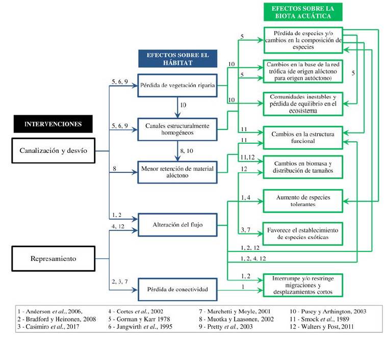 A su vez, estas alteraciones del hábitat tienen efectos negativos sobre la biota acuática (Fig. 3). Por ejemplo, los ambientes que sean canalizados al ser estructuralmente homogéneos presentarán una reducción en el número de especies, lo que puede llevar a una menor estabilidad temporal de las comunidades (i.e., pérdida de equilibrio en el ecosistema; Gorman y Karr, 1978) además de cambios en su estructura funcional (Smock et al., 1989). Así mismo, la alteración del flujo puede generar cambios en la composición de especies, biomasa, distribución de tamaños (Walters y Post, 2011) y estructura funcional de la biota acuática (Cortes et al., 2002; Anderson et al., 2006; Jones et al., 2008; Fig. 3). Otros posibles efectos son cambios en la base de la red trófica (de origen alóctono para origen autóctono; Pusey y Arthington, 2003), establecimiento de especies exóticas (Marchetti y Moyle, 2001; Casimiro et al., 2017) e interrupción/restricción de migraciones o de desplazamientos cortos (Anderson et al., 2006; Fig. 3).