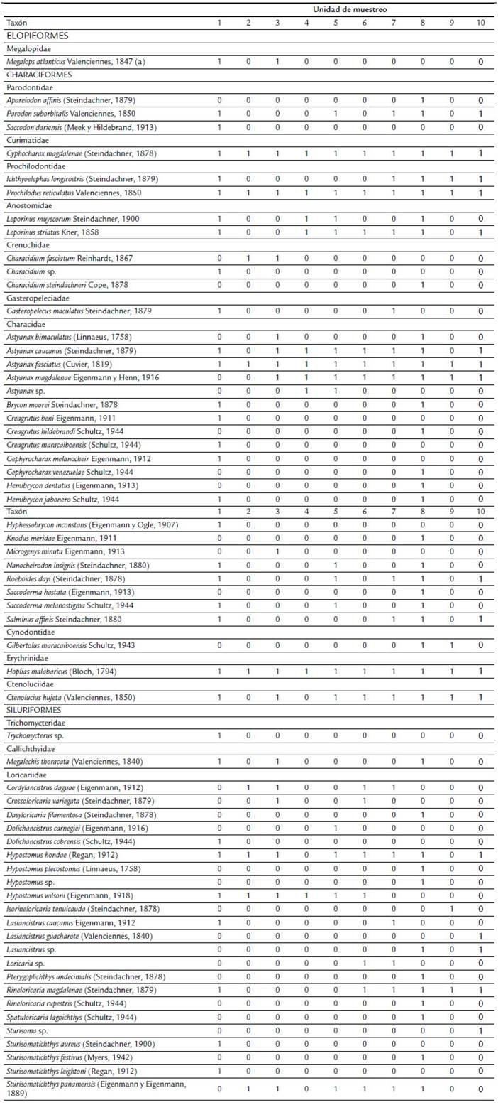 Matriz de composición de especies de peces de la cuenca del río Ranchería (1-10) y del área de concesión minera (2-10), datos extraídos de Olaciregui (2014). Las unidades de muestreo siguen el orden de Olaciregui (2014): 1- Integral 1982; 2- Ambiotec 1998; 3- Ambiotec 1999; 4- Ambiotec 2001; 5- Ambiotec 2002; 6- Araguatos 2002; 7- Araguatos 2003-2004; 8- FHGD 2005-2006; 9- J.D.B 2009-2010; 10-Omacha 2012-2013. La clasificación taxonómica sigue Reis et al. (2003); excepto Agonostomus monticola (Bancroft, 1834); Pomadasys crocro (Cuvier 1830) y Oreochromis mossambicus (Peters 1852) que siguen a Nelson (2006). (a) especies marinas, (b) especie introducida.