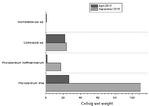 Prorocentrum lima (52±48 cells/g substrate wet weight) was the epiphyte dinoflagellate with greater presence, followed by Ostreopsis sp. (19±18 cells/g) and Prorocentrum hoffmannianum (27±24 cells/g).