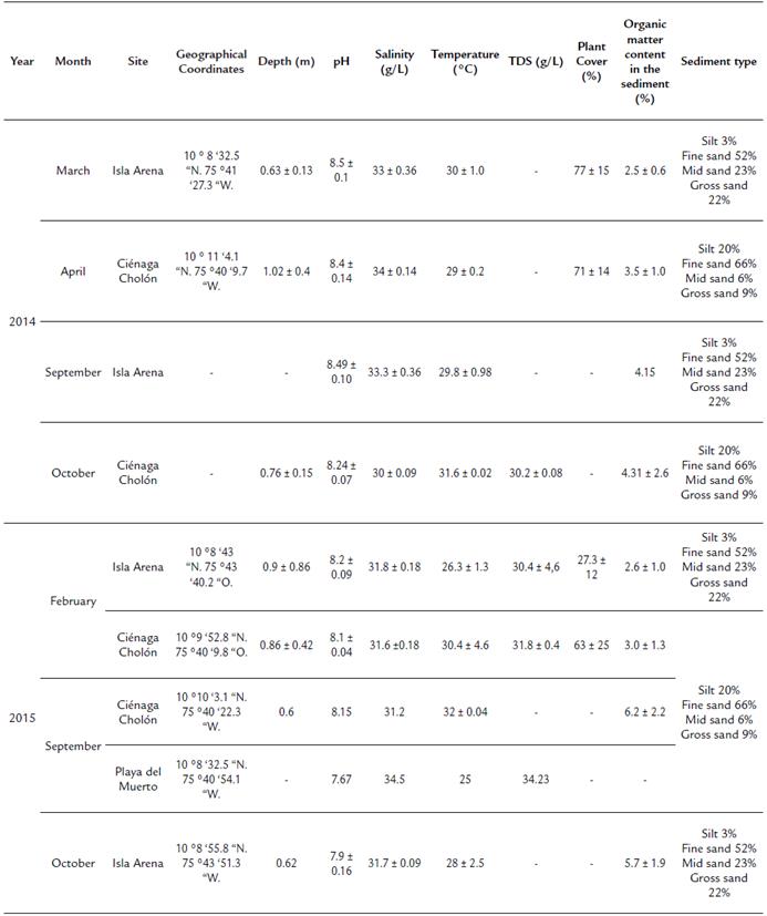 The samples were collected during April 11 and September 25 of 2015 at three sites on the Isla de Barú: Isla Arena (IA) (10° 8' 40' N, 75° 43' 37'' W), Playa del Muerto (PM) (10° 8' 22" N, 75° 40' 42" W) and Ciénaga Cholón (cC) (10° 9' 53" N, 75° 40' 10" W) (Fig. 1). The type of sediment is highly variable between Isla Arena and Playa del Muerto, the former mainly consists of medium and coarse sands, while the second is made up of fine sands and silts (Table 1).