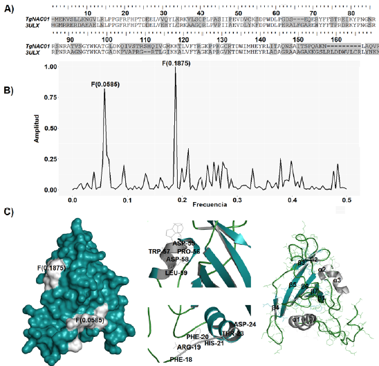 Figura 1: (A) Secuencia de residuos de aminoácidos de las proteínas TgNAC01 y 3ULX, resaltando los dominios conservados en común. (B) Análisis del espectro de la información consenso entre los factores de transcripción TgNAC01 y 3ULX, se muestra dos picos de frecuencia F = 0.0585 y F=0.1875. (C) Modelación proteica del factor de transcripción TgNAC01, donde se muestra la estructura secundaria del FT, además de la región de aminoácidos, con gran potencial de interacción ion-electron.
