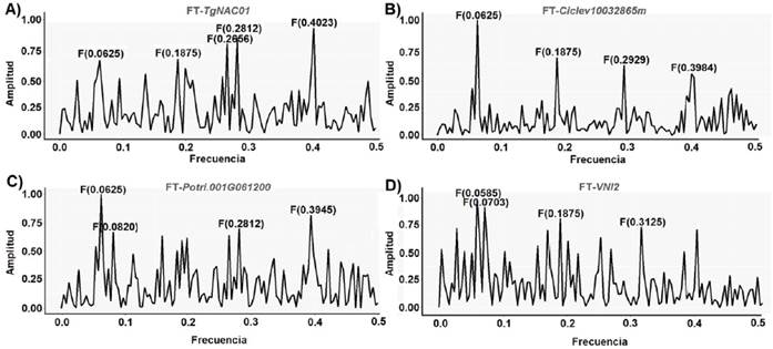 Figura 2: (A) Espectro de la información (EI) de la secuencia del FT TgNAC01, (B) correlación de amplitud y frecuencia de gen FT Ciclev10032865 de Citrus clementina, (C) (EI) del FT de la especie P. trichocarpa (Potri.001G081200.2), (D) (EI) del gen master regulador VNI2 de Arabidopsis thaliana.