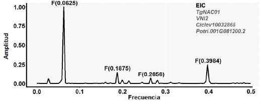 Por otra parte, el análisis de espectro de la información de tres FTs ortólogos de TgNAC01 (Ciclev10032865m, Potri.001G061200.2 y VNI2), muestra picos diferentes, debido a la diversidad de funciones biológicas que tienen los genes reguladores (Fig. 2). La decodificación de la información a partir del espectro de frecuencias y amplitud de las secuencias proteicas de esos tres factores de transcripción (Fig. 2), muestran divergencia evolutiva, siendo esto característico de los FTs y genes implicados en evolución adaptativa de diversas funciones metabólicas y la regulación de las mismas. Respecto al método del espectro de la información (MEI), se observaron mutaciones en el gen NAC que potencialmente alteran la amplitud del pico dominante en F=0,0625, e influirían en la afinidad de unión del factor de transcripción con el promotor de otros genes enzimáticos y otros FTs. Es importante señalar también que la inspección del espectro de información (EI) para el FT VNI2 individualmente, no muestra una amplitud en la F=0.0625, pero sí en las frecuencias F=0.0585 y F=0.0703. De ese modo, se encontró que cambios en las secuencias de aminoácidos divergieron en función de esos picos de frecuencia (Fig. 2D). Para identificar los cambios que contribuyen a la evolución del gen, se calculó la variación de los cuatro genes en función de espectro consenso, notando de ese modo que TgNAC01 y Ciclev10032665m de Citrus clementina comparten dos picos de frecuencia, los cuales son F=0.0625 y F=0.1875 (Fig. 3). Además, este último también es compartido con el FT VNI2 (Fig. 3). Por otro lado, se muestran dos picos dominantes, para los FTs TgNAC01 y Potri.001G061200.2, con F=0.0625 y F=0.2812, respectivamente (Fig. 2).