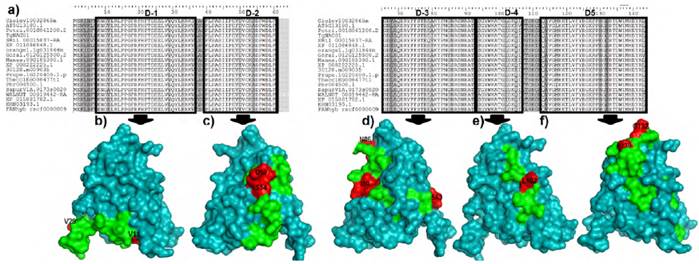 Figura 5: (A) Alineamiento de secuencias factores de transcripción NAC ortólogos al gen TgNAC01 de Teca. B) Identificación del dominio funcional D-1 y aminoácidos V20 y V11 que mutaron temporalmente. (C) Selección del dominio conservado D-2, presentando 2 aminoácidos D50 y S54 con mayor cambio evolutivo. (D) Secuencia conservada de aminoácidos D-3 y ubicación en la estructura proteica de las 3 mutaciones más frecuentes, situados en N86, I80 y S63. (E) Dominio D-4 y cambios en el aminoácido L102. (F) Secuencia conservada D-5 y cambios en la secuencia primaria del dominio en los K130 y C132.