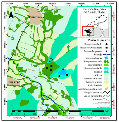 Figura 1: Manantial de Cañaverales, mapa general de usos y coberturas con la ubicación de los sitios de estudio. Sitio 1: bosque inundable, Sitio 2: bosque no inundable y Sitio 3: matorral espinoso. (Tomado de Corpoguajira, 2011).