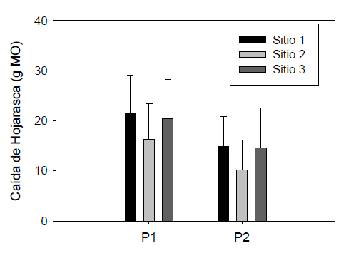 Figura 3: Variación de los niveles de MO aportada por la hojarasca en los tres sitios evaluados (Sitio 1. bosques inundables; Sitio 2. bosques no inundables y Sitio 3. matorral espinoso) y entre eventos de lluvia (P1) y sequía (P2). Las barras representan los valores promedio y las líneas acotadas ± 1 desviación estándar.