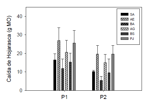 Figura 4: Variación de los niveles de MO aportada por la hojarasca de las seis especies vegetales evaluadas y entre eventos de lluvia (P1) y sequía (P2). Las barras representan los valores promedio y las líneas acotadas ± 1 desviación estándar.