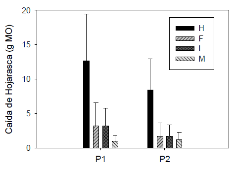 Figura 5: Variación de los niveles de MO aportada por cada fracción de la hojarasca, entre eventos de lluvia (P1) y sequía (P2). Las barras representan los valores promedio y las líneas acotadas ± 1 desviación estándar.