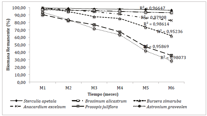 En el análisis exploratorio, se destaca que la relación entre el porcentaje de descomposición de la hojarasca foliar de las especies evaluadas y los muestreos, presentó un ajuste (R2) con el modelo exponencial oscilando entre 0.95 y 0.99 (Fig. 6). Las constantes de descomposición de S. apetala (SA), A. excelsum (AE), B. alicastrum (BA), A. graveolen (AG), B. simaruba (BS) y P. juliflora (PJ) fueron de 0,258, 0,270, 0,299, 1,055, 0,757 y 1,095 respectivamente, con diferencias significativas (KW=33.527, gl=5, p<0.01). SA fue la especie más persistente, con un tiempo medio de permanencia cuatro veces más alta que el de la especie PJ, que presentó los mayores aportes de hojarasca y las mayores tasas de descomposición al igual que la AG.