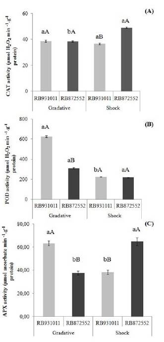 Figure 1: Activity of CAT (A), POD (B) and APX (C) enzymes in the sugarcane varieties RB 931011 and RB 872552 grown in vitro and submitted to gradual or sudden NaCl application to the culture medium. Identical letters, upper case between varieties and lower case letters between conditions of stress application, do not differ among themselves by the Tukey test at 5 % probability.
