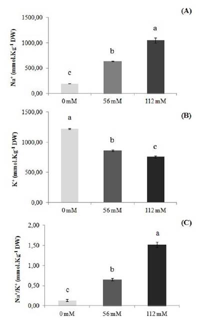 Figure 2: Concentration of Na+ and K+ ions and Na+/K+ ratio in two sugarcane varieties (RB931011 and RB872552) grown in vitro under different levels of NaCl. Different letters over the columns indicate a significant difference by the Tukey test at 5 %. (A) Na+ content; (B) K+ content and (C) Na+/K+ ratio.