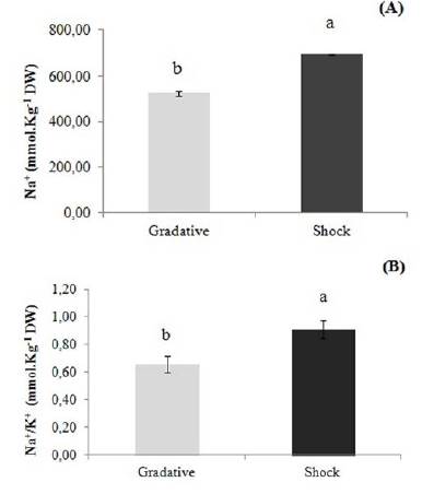 Potassium (K+) and sodium (Na+) content, as well as Na+/K+ ratio, presented the following aspects: There was a positive association between the NaCl concentration in the culture medium and the sodium (Na+) content, displaying an accumulation in the aerial part of the varieties analyzed. Fig. 2 shows an increase (7.8 times) in Na+ content and a decrease (1.7 fold) in K+, with a consequent increase in the Na+/K+ ratio caused by the addition of NaCl in the in vitro culture medium. The effect of interaction between NaCl amount and the stress inducing condition was significant for Na+ and K+ content and Na+/K+ ratio. In the non-gradual induction of salt stress, the Na+ content and the Na+/K+ ratio were higher than that of the plants subjected to gradient stress (Fig. 3B).
