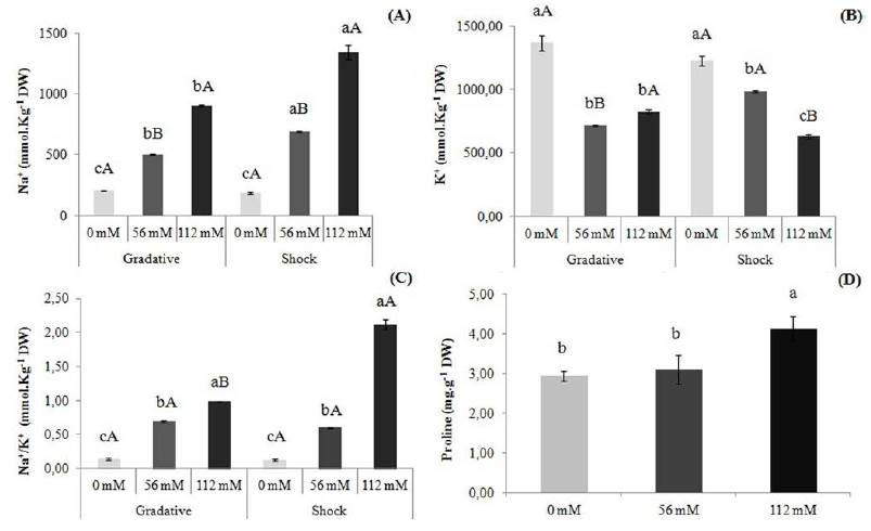 Figure 4: (A) Na+ content; (B) K+ content; and (C) Na+/K+ ratio in two sugarcane varieties (RB931011 and RB872552) grown in vitro in response to the concentration of NaCl (T0 = 0 mM, T1 = 50 mM and T2 = 100 mM) and condition of application (gradual or shock) of salt stress. Identical upper case letters between the conditions of salt stress induction and lowercase between NaCl amount do not differ among themselves by the Tukey test at 5 % probability; (D) Proline content in two sugarcane varieties (RB931011 and RB872552) grown in vitro under different levels of NaCl. Different letters over the columns indicate a significant difference by the Tukey test at 5 %.