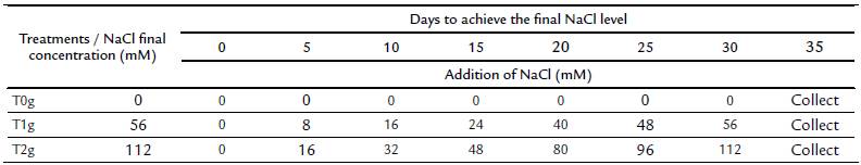 Two commercial sugarcane genotypes (RB931011 and RB872552) were submitted to salt stress in vitro by addition of NaCl to the culture medium. The plants were obtained from the in vitro growth in a Temporary Immersion System, provided by the Biofábrica Governador Miguel Arraes, from the Northeast's Center of Strategic Technologies (CETENE). During the experiment's initial stage - acclimatization- the culture was maintained in basic liquid medium (BLM), consisting of MS (Murashige and Skoog, 1962) minerals and vitamins plus sucrose (3 %). The pH of the medium was adjusted to 5.8 before autoclaving at 120 °C and 104 kPa for 20 minutes. A total amount of 20 mL of medium was dispensed into 250 mL capacity pots. A sum of 1,200 plants were selected, 600 plants of each variety, during the final phase of rooting, done in temporary immersion bioreactors, they were submitted to one month acclimatization before the treatment application. After this period of 30 days of acclimation, five plants with greater vigor were selected and transferred to each flask with approximately 20 mL of medium, in which the different salt concentrations were applied. The experiment was maintained for 35 days in the plant growth chamber at a temperature of 27 ± 2 °C with a photoperiod of 16 hours, light intensity of 50 μmol.m-2 s-1 provided by cold white light. Two salt treatments were established (T1 = 56 mM NaCl, T2 = 112 mM NaCl), in addition to a control treatment (T0) without the addition of NaCl. The graded treatments (T1g and T2g) were applied by transferring the five plants to pots containing the following NaCl levels: T1g = 8 mM NaCl; T2g = 16 mM NaCl. From these concentrations (8 and 16 mM NaCl), five milliliters (5 mL) of medium were added every five days, increasing the salt concentration in 8 mM or 16 mM NaCl for the treatments T1g and T2g, respectively, until each treatment reached its final concentration, which were 56 mM for T1g and 112 mM for T2g, as shown in Table 1. For the salt shock treatment, the plants were transferred directly to culture medium with the concentrations of 56 mM (T1c) and 112 mM NaCl (T2c).