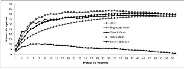La curva de acumulación de especies para todo el estudio alcanzó la asíntota, lo cual indica que se realizó un muestreo completo. Este resultado se confirmó ya que se capturaron 39 especies de las 39-40 esperadas según los estimadores de riqueza (Fig. 1). La diversidad y equidad más alta fue hallada en el borde de bosque, según los índices de dominancia y equidad de Shannon y el número de Hill 1, (H' = 2,76, Hill = 15,82) (Tabla 1). El bosque ripario le siguió en diversidad y equidad al borde del bosque (Fig. 1).