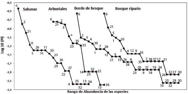 Figura 2: Curvas de rango-abundancia. La numeración de las especies se puede consultar en la Tabla 1.