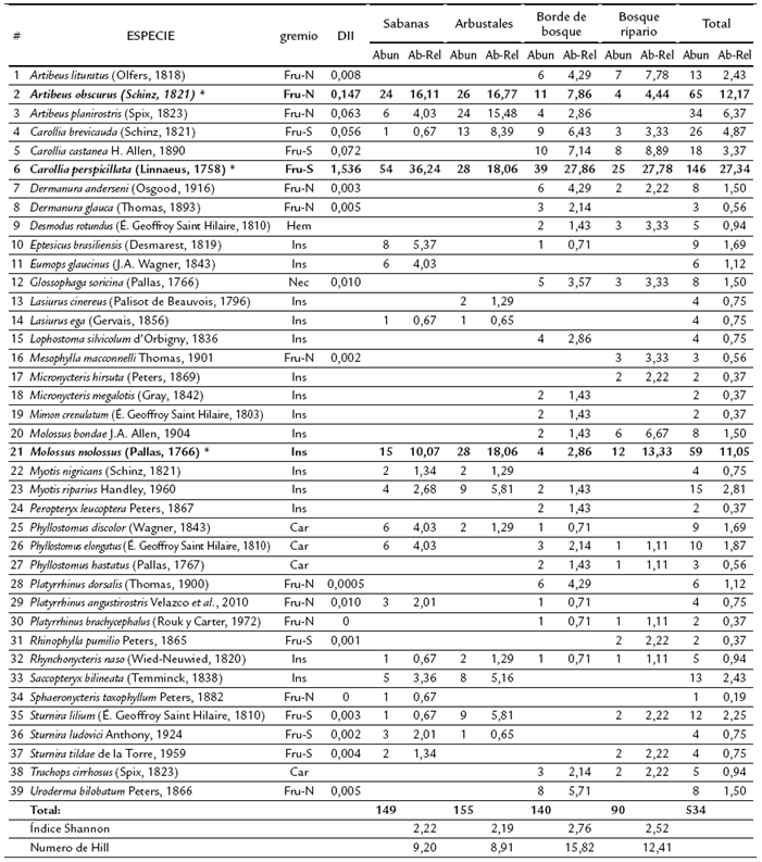 El esfuerzo total de muestreo fue de 159120 m2red*h y se obtuvo un éxito de captura de 0,336 individuos/m2red*h. En total se capturaron 534 murciélagos pertenecientes a cuatro familias, 24 géneros y 39 especies (Tabla 1). La especie más frecuente en el muestreo fue Carollia perspicillata (Linnaeus, 1758) (27 % de las capturas), seguida por Artibeus obscurus (Schinz, 1821) (12 %) y Molossus molossus (Pallas, 1766) (11 %). Las tres especies fueron registradas en los cuatro hábitats muestreados. Vale la pena resaltar la presencia de Sphaeronycteris toxophyllum Peters, 1882, capturado en la sabana. Este murciélago frugívoro suele encontrarse en zonas de bosques amazónicos densos conservados, así como en sabanas naturales y bosques riparios orinocences, entre otros (Tavares y Lewis, 2008). Es una especie frugívora especialista (Angulo et al., 2008), poco común, con bajas abundancias dadas las restricciones de su dieta, que dependen de la disponibilidad de los frutos que consumen, al igual que la de otros murciélagos frugívoros pequeños (Kalko, 1998) como Mesophylla macconnelli Thomas, 1901, Dermanura sp., Uroderma bilobatum Peters, 1866 y Platyrrhinus angustirostris Velazco, Gardner y Paterson, 2010, también reportados es este estudio.