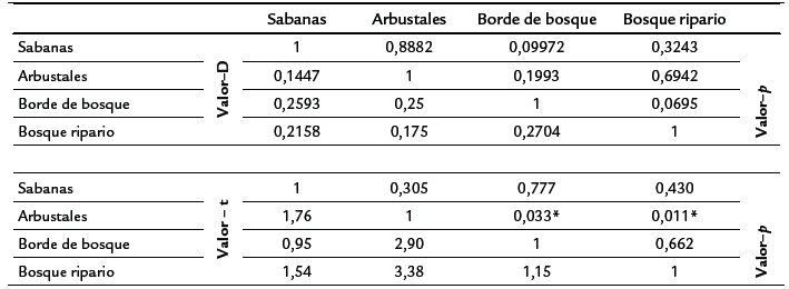 Al comparar las curvas de rango abundancia entre los cuatro estados sucesionales, estos exhibieron una alta uniformidad (Tabla 2), donde la prueba de Kolmogorov-Smirnov, indicó que ninguna de las distribuciones presenta diferencias significativas entre sí (p < 0,05). El estadístico de contraste D, corroboró el análisis en el mismo sentido (Fig. 2). Por su parte los análisis de similitud entre curvas de rango abundancia de murciélagos indican asociaciones entre los estados sucesionales de áreas abiertas con una menor complejidad vegetal, las sabanas y los arbustales (Is = 0,813) a diferencia de los estados sucesionales de borde de bosque y bosque ripario (Is = 0,638).