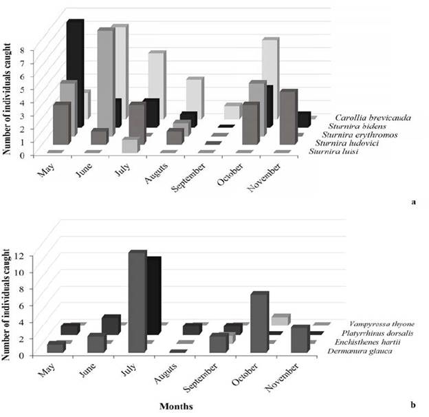 Figure 1: Number of individuals (of bats) caught between May and November 2014 in the BFR. a) Sedentary frugivores, b) Nomadic frugivores.