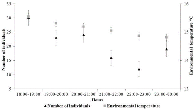 Figure 2: Number of individuals (of bats) captured by hour of the night and air temperature in the BFR.