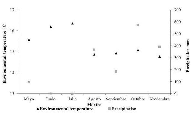 In contrast to rainfall, values for temperature were higher from May to June and lower between August and November (Fig. 3). In example, during June and July were recorded the highest average values of the temperature, 16.20 and 16.35 °C respectively. However, there was no precipitation at the sampling periods corresponding to these months. On the other hand, October and November presented the highest records of precipitation with 572 and 392 mm respectively, and low temperature, being November the coldest month in the sampling period with 14.77 °C. During the study, daily temperature fluctuates between 13.58 °C and 17.13 °C, exhibiting a low range of variation (3.55 °C) compared to historical records (12.00-21.00 °C, with a range of 9.00 °C).
