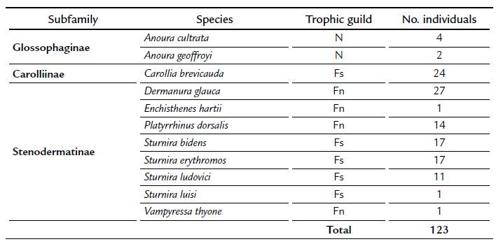 Sample representativeness ranged from 69 to 79 % of the expected species richness. A total of 123 individuals belonging to 11 species of the Phyllostomidae family were captured during 42 nights of sampling. Three trophic guilds were represented: 4.88 % of captured individuals were nectarivores, 34.96 % were nomadic frugivores, and 60.16 % were sedentary frugivores (Table 1).The most captured species were Dermanura glauca (21.95 % of total captures), Carollia brevicauda (19.51 %), Sturnira erythromos (13.82 %), Sturnira bidens (13.82 %), Sturnira ludovici (12.20 %), and Platyrrhinus dorsalis (11.38 %). The species Sturnira luisi, Anoura cultrata, Anoura geoffroyi, Enchisthenes hartii, and Vampyressa thyone accounted for the remaining 7.32 % of captures.