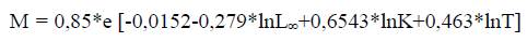 Para la estimación de F se consideraron valores de Fmax que variaron entre 0,0 a 2,5 año-1 y los valores de Z=M+F dependieron del valor asignado a F. M fue estimada con la siguiente ecuación y se ajustó al 85 % de su valor según lo recomendado por Pauly (1983).