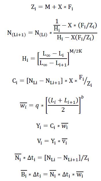 Donde, H es el factor de mortalidad natural, C es la captura en número (n), Y es el rendimiento o captura en peso por año (kg), N es la población en número (n), V es el valor anual de la captura ($) y w es la captura en peso (kg). Los valores se estimaron por intervalo de clases de LE; donde i se refiere a un intervalo de clase específico, L es el límite inferior del intervalo de clase y Li+1 al límite superior del mismo e incluye X como factor de mortalidad (F).