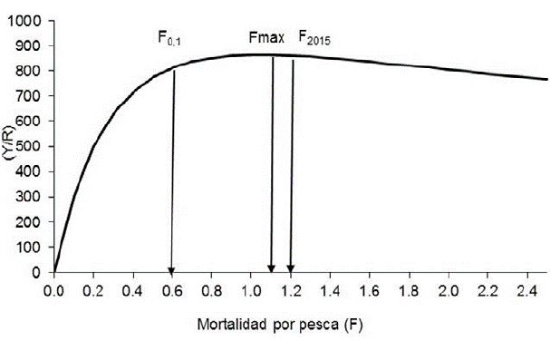 Fmax fue estimada en 1,1 año-1, F0,1 en 0,6 año-1; mientras que F2015 se calculó en 1,2 año-1 con biomasa media instantánea de 34,4 tm. La figura 1 muestra la curva de rendimiento por recluta (Y/R).